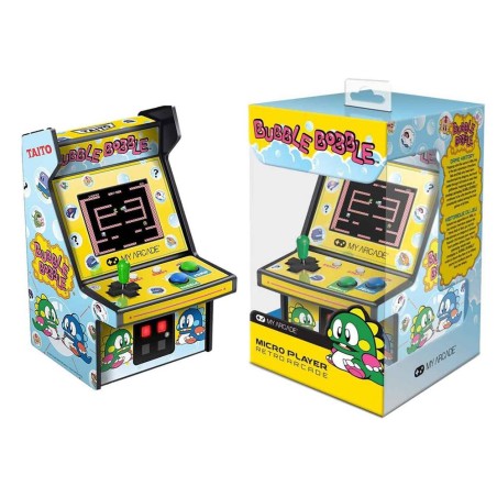 My Arcade Bubble Bobble Micro Player Presenta grafiche ispirate al cabinato arcade Bubble Bobble originale Schermo a colori da 2 75 Joystick rimovibile Perfetto per qualsiasi sala giochi ufficio o vetrina Controllo del volume e jack per cuffie da 3 5 mm Richiede un alimentatore micro USB 5 V CC 1 A minimo 300 mA o 4 batterie AA non inclusi