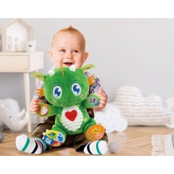 Manine e piedini del draghetto se premute riproducono brani musicali che stimolano la lallazione e filastrocche che introducono i numeri e tante curiosità sulla natura per imparare giocando
