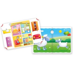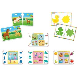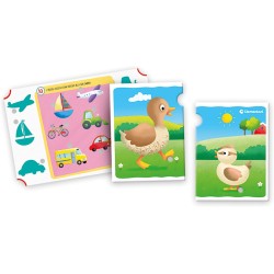 Inoltre la confezione include un set di tessere in cartone innovative che propongono associazioni tra soggetti e colori e tra animali e cuccioli