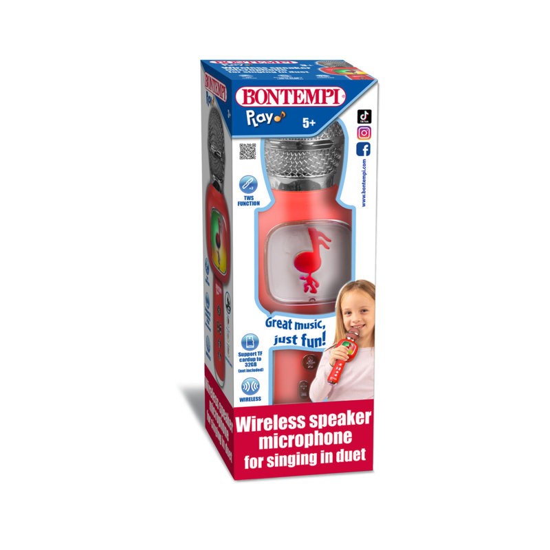 Microfono speaker wireless per cantare in duetto Funzione Karaoke on off voice riproduci tutte le tue canzoni preferite e SPEGNI la voce originale sulla musica ORA sei tu il cantante Effetto cambia voce Puoi riprodurre musica audio da una scheda micro SD non fornita da uno smartphone tablet PC Laptop ecc utilizzando la connessione wireless Bontempi485110 Funzione TWS puoi collegare senza fili un altro microfono identico e cantare in duetto Regolazione del volume della traccia in riproduzione Tasti di selezione traccia precedente successiva Slot per scheda Micro SD TF Presa USB Type C per caricare la batteria interna al litio cavo di ricarica incluso Dim 230x75x65 mm
