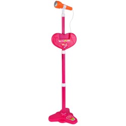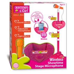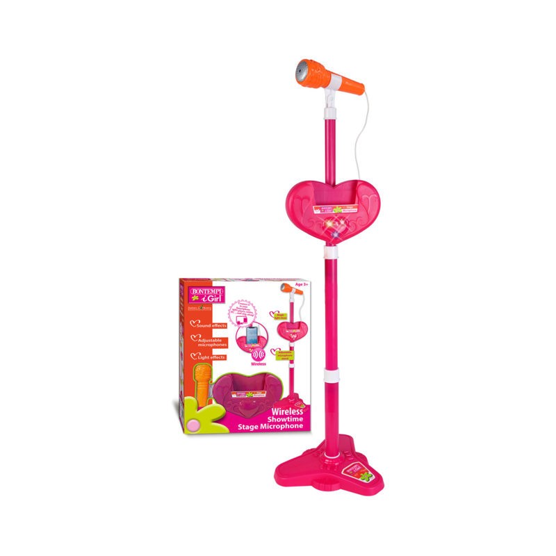 Microfono da palcoscenico Connessione Wireless connessione ad una fonte musicale esterna lettore MP3 tablet smartphone per riprodurre la tua musica Asta regolabile in altezza Microfono per la voce con posizione regolabile Effetti sonori Effetti luminosi Vano porta smartphone Alim 3 batterie da 1 5V R6 AA non fornite Dim 210x210x1000 mm