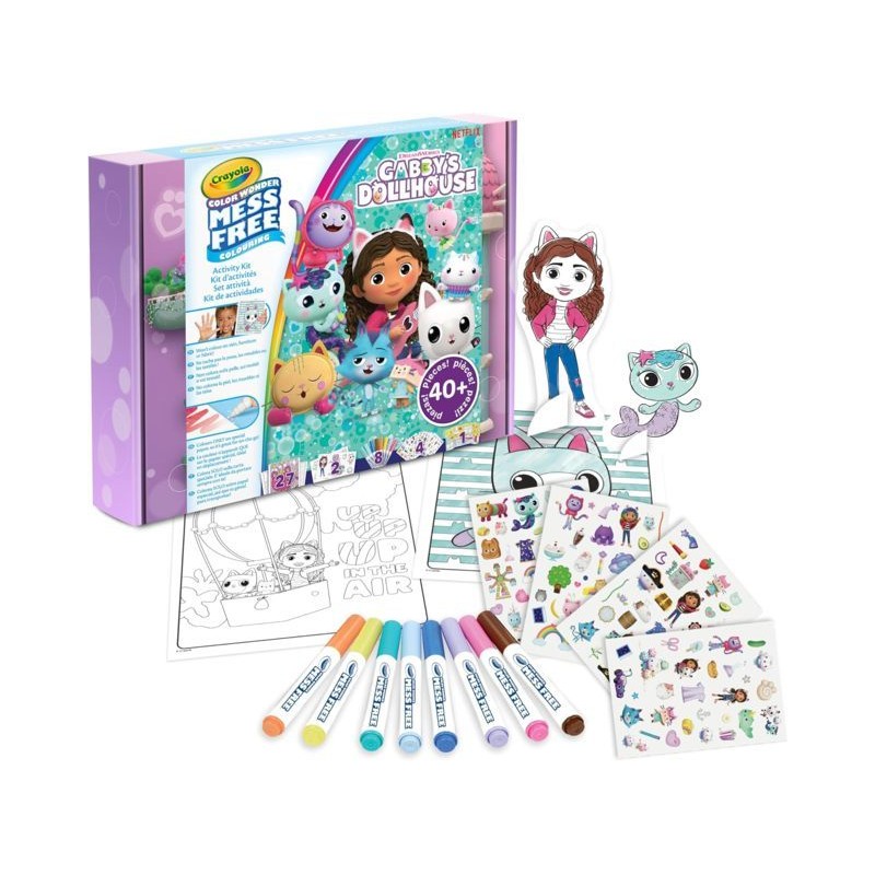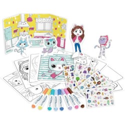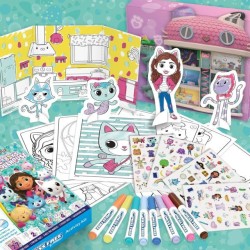 RICCO SET CON 40 PEZZI che comprende 27 pagine da colorare 8 pennarelli senza macchia 4 pagine di adesivi personaggi in cartoncino pop up da costruire e sfondo colorabile il tutto racchiuso in un favoloso astuccio tematizzato che tutti i fans di Gabby s Dollhouse ameranno