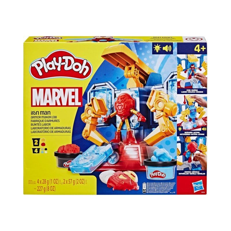 SCEGLI E CREA L ARMATURA DI IRON MAN aiuta Iron Man a prepararsi per la battaglia Scegli 1 dei 3 stampini per l armatura fissalo al set da gioco e premi la levetta per stampare l armatura in Play Doh direttamente sull action figure di Iron Man
