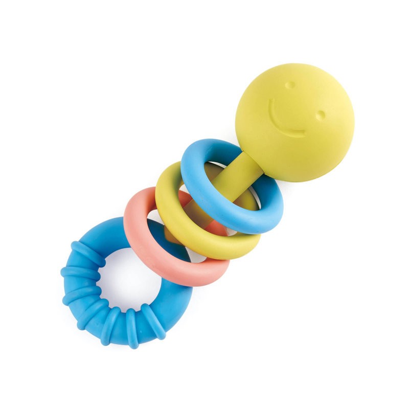 Realizzato con materiale sicuro a base di riso è dotato di tre anelli mobili e tintinnanti per stimolare la consapevolezza sensoriale e un anello con massaggia gengive da masticare