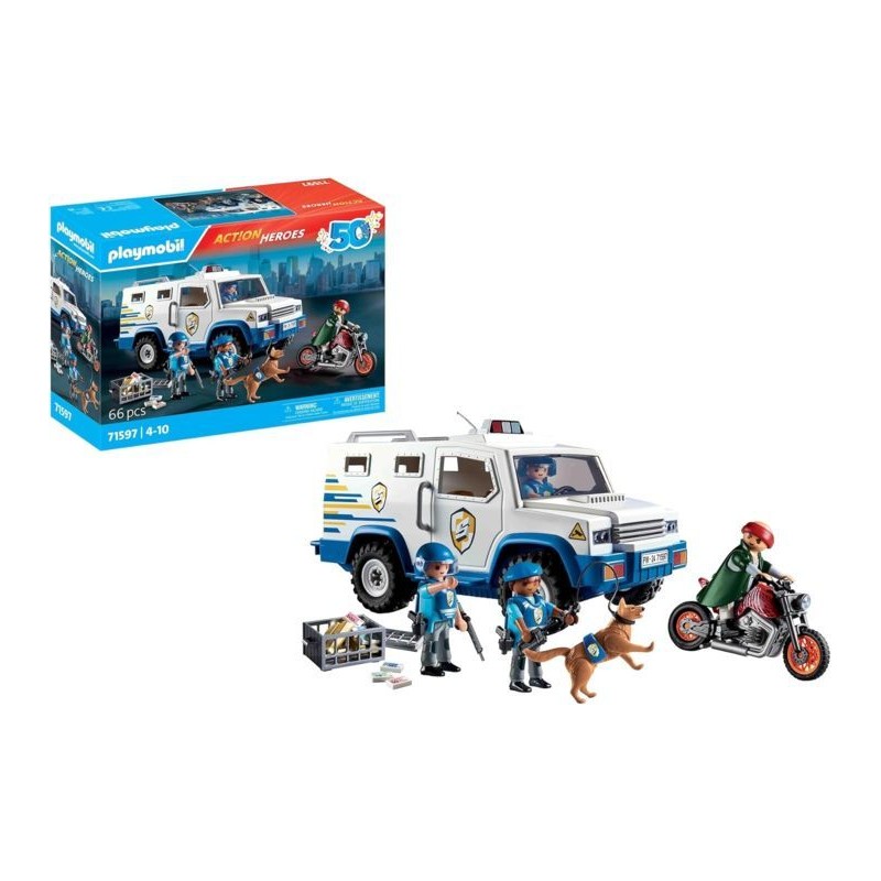 Attrezzatura Carica di Azione Il furgone portavalori è dotato di tutto il necessario per un avventura emozionante come banconote e lingotti d oro Perfetto per piccoli detective Ora riproposto in occasione del 50 anniversario di PLAYMOBIL