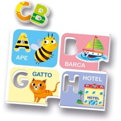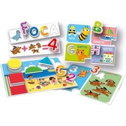 Contiene un set di lettere e numeri in plastica coloratissimi un alfabetiere e un numeriere puzzle per giocare con le associazioni