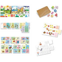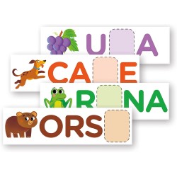 Inclusi nel kit anche schede illustrate da completare con le formine in cartone e un set di schede con parole da scrivere con le letterine di plastica