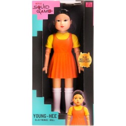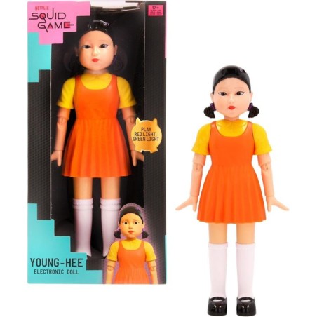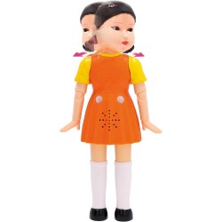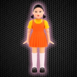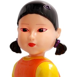 Statuetta accuratamente realizzata Bambola Youngh hee dalla sfida Red Light Green Light di Squid Game Questo personaggio iconico della serie è alto 29 cm Ha testa rotante due sensori di movimento e occhi luminosi Ha un altoparlante che riproduce i suoni originali della serie