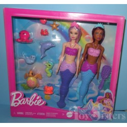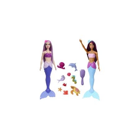 Sirene 2 Pack è una bambola della linea Barbie La bambola è stata prodotta da Mattel nel 2024 MPN HRG71 La bambola presenta la testa dello Skipper della Dreamhouse e della Dea coda da sirena e corpetto modellato La bambola ha occhi dipinti di colore grigio e lilla ciglia dipinte capelli radicati di colore lilla e viola braccia dritte Il set comprende corallo granchio delfino spazzola per capelli polpo cavalluccio marino foca conchiglia stella marina diademi 2 e tartaruga