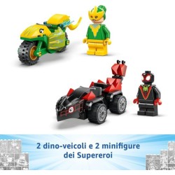 Dino veicoli giocattolo da costruire con le minifigure LEGO di Spin ed Electro il set include una moto e una macchina giocattolo da costruire oltre ad una guida e un grande Starter Brick con cui iniziare rapidamente i giochi di ruolo
