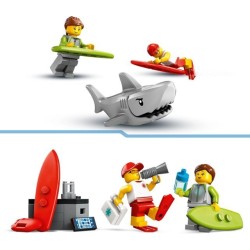 Cosa include il set La scatola LEGO comprende una jeep giocattolo da costruire oltre alle minifigure del bagnino e del surfista e uno squalo giocattolo per dar vita a giochi di fantasia in spiaggia
