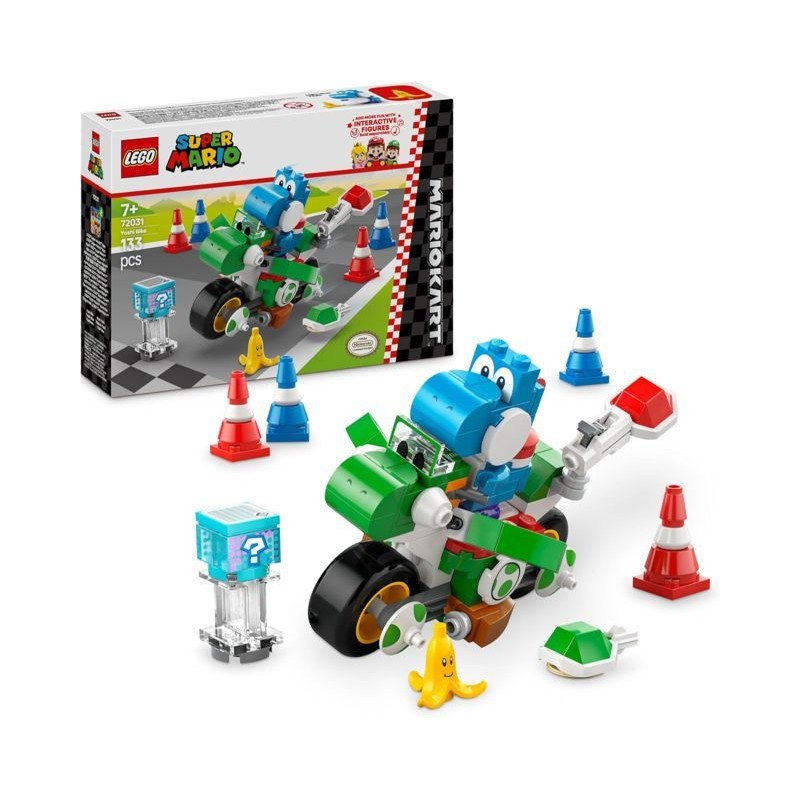 Moto giocattolo da costruire posiziona Yoshi azzurro sulla Moto Yoshi e guida tra 4 coni stradali lancia gusci dalla moto ed evita la banana un divertente set LEGO Mario Kart da collezione