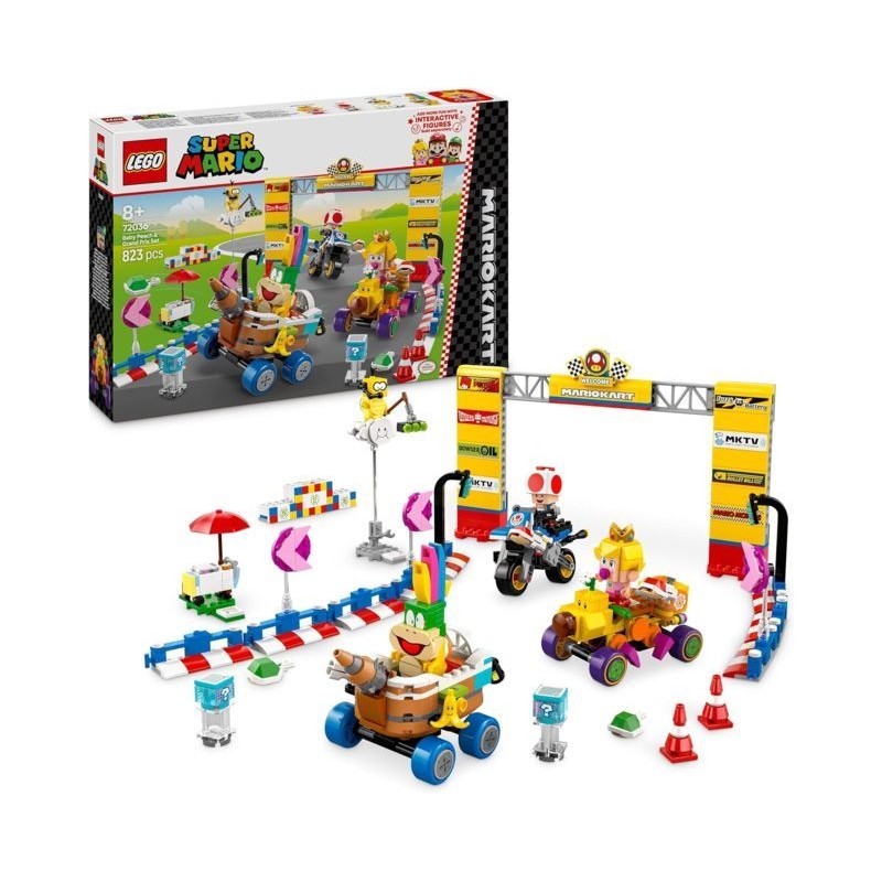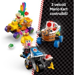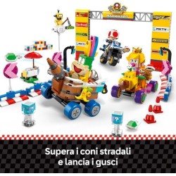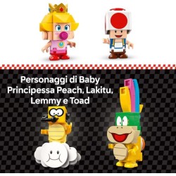 4 personaggi Mario Kart collezionabili questo set di giochi d avventura con i mattoncini LEGO include i personaggi di Baby Principessa Peach Lakitu Lemmy e un Toad giocattolo oltre a accessori assortiti per il gioco di ruolo