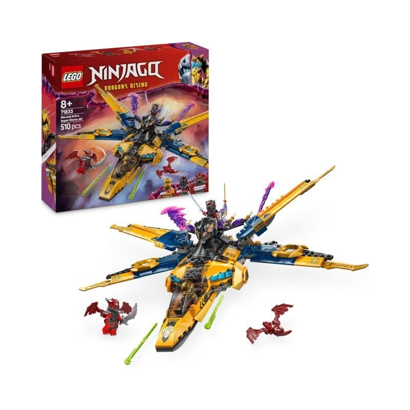 Ricco di funzionalità il l aereo LEGO NINJAGO Jet Super Storm di Ras e Arin è dotato di 2 shooter a molla di ali regolabili di lame della tempesta vorticanti e di lame e motori rimovibili da utilizzare come armi ninja