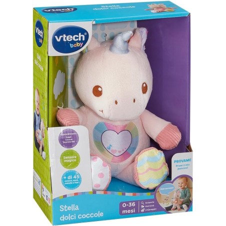 CUORE LUMINOSO Stella ha un pulsante luminoso a forma di cuore sul pancino con variazioni di colore che può essere utilizzato dal bebè per attivare musica soft e frasi divertenti