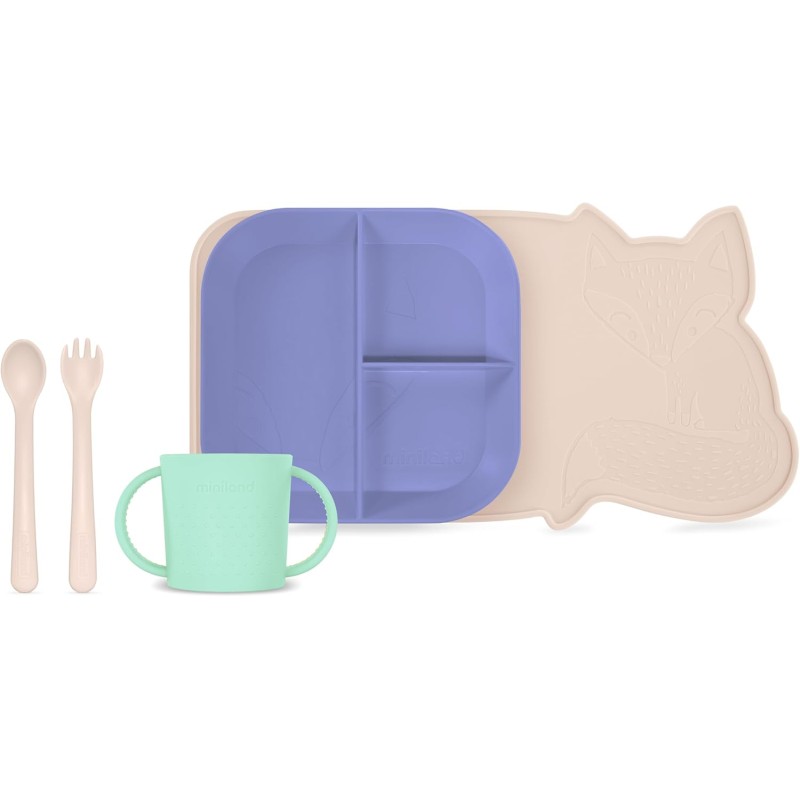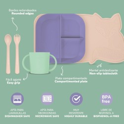 Tazza con manici grandi e base spessa per una facile presa e stabilità Tappetino in silicone antiscivolo per un facile apprendimento Piatto compartimentato per facilitare l equilibrio nutrizionale Cucchiaio e forchetta di grande capacità con punte arrotondate Realizzato in Spagna con materiali molto resistenti e durevoli Lavabile in lavastoviglie e nel microonde