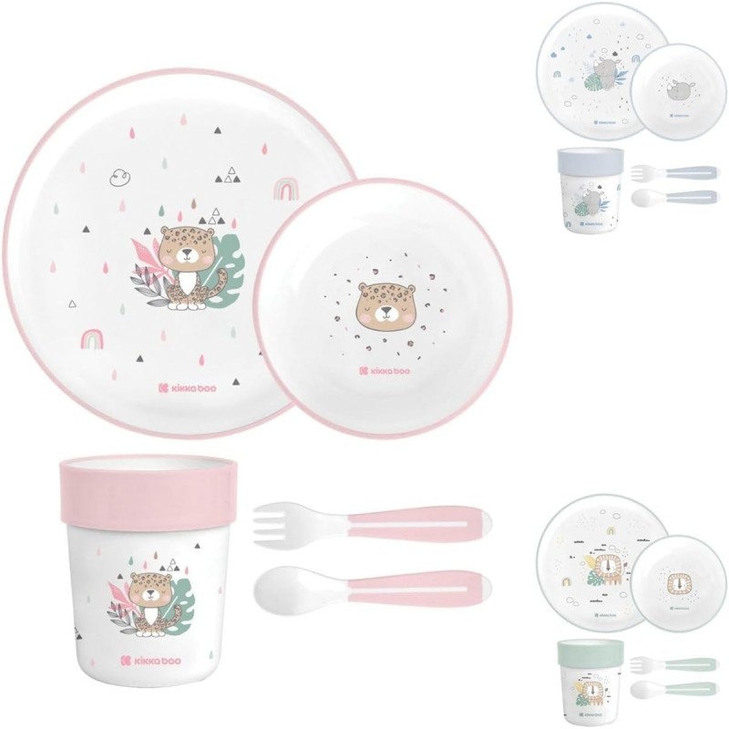 Set di stoviglie per bambini 5 pezzi per bambini da 6 mesi in plastica con tazza piatto forchetta cucchiaio e scodella tazza 180 ml piatto 18 cm facile da pulire con simpatico motivo di animali aiuta il bambino ad esercitarsi a mangiare in modo indipendente ideale anche per la pappa