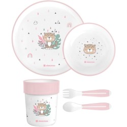 Set di stoviglie per bambini 5 pezzi per bambini da 6 mesi in plastica con tazza piatto forchetta cucchiaio e scodella tazza 180 ml piatto 18 cm facile da pulire con simpatico motivo di animal
