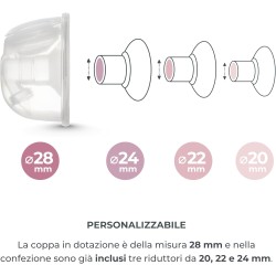 Opzioni di Misura Versatili Include una coppa anatomica per il seno da 28mm e tre riduttori 20mm 22mm 24mm per garantire una vestibilità perfetta e un esperienza di estrazione confortevole per diverse dimensioni del seno