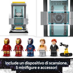 Azione e avventura di Iron Man il laboratorio contiene 3 capsule di armature collegabili alle precedenti versioni di giochi LEGO Marvel una piattaforma di manutenzione con 2 bracci robotici e un dispositivo di scansione oltre a 2 shooter