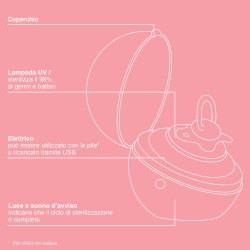 VELOCE STERILIZZA IN 3 MIN sterilizza il ciuccio in soli 3 minuti lo sterilizzatore portatile emette un segnale acustico quando la sterilizzazione è completa e il ciuccio è pronto per essere riutilizzato