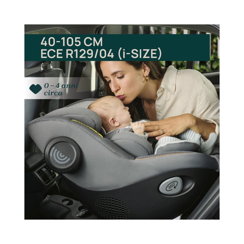 Seggiolino auto rotante per neonati e bambini da 0 a circa 4 anni 40 105 cm ECER129 04 i Size Reclinabile in 6 posizioni con una sola mano contro o verso il senso di marcia per mantenere sempre la testa del bambino nella posizione corretta Riduttore modulare a lunga durata fino a 75 cm per garantire protezione e postura ergonomica allo stesso tempo Dì addio al mal di schiena Con il Sistema Easy Boarding il posizionamento del bambino nel seggiolino auto sarà facile e senza sforzo sia in configurazione contro il senso di marcia che in senso di marcia Posizionamento del bambino più facile con il sistema Fast Fit sistema innovativo che mantiene gli spallacci aperti e tiene sempre visibili e accessibili i ganci della fibbia Inserti in fibra di bambù morbido e traspirante particolarmente adatto alla pelle delicata del bambino Il tessuto di bambù è anche in grado di assorbire rapidamente l umidità aiutando a regolare la temperatura corporea