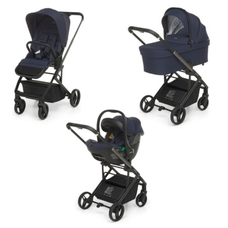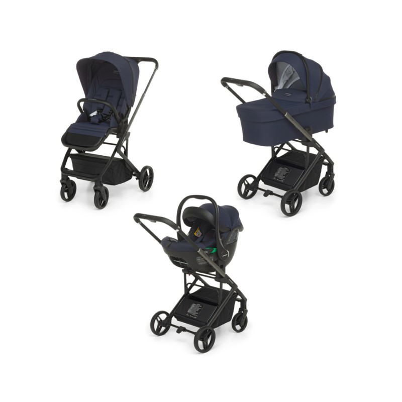 Sul leggero telaio in alluminio Self Standing con dettagli cromati possono essere montati la navicella spaziosa sfoderabile e pieghevole per chiusura compatta poi la seduta passeggino reversibile e chiudibile fronte strada e fronte mamma con schienale areato utilizzabile fin dalla nascita e il seggiolino auto i Size per i primi mesi per bambini da 40 a 87 cm di altezza max 13 kg