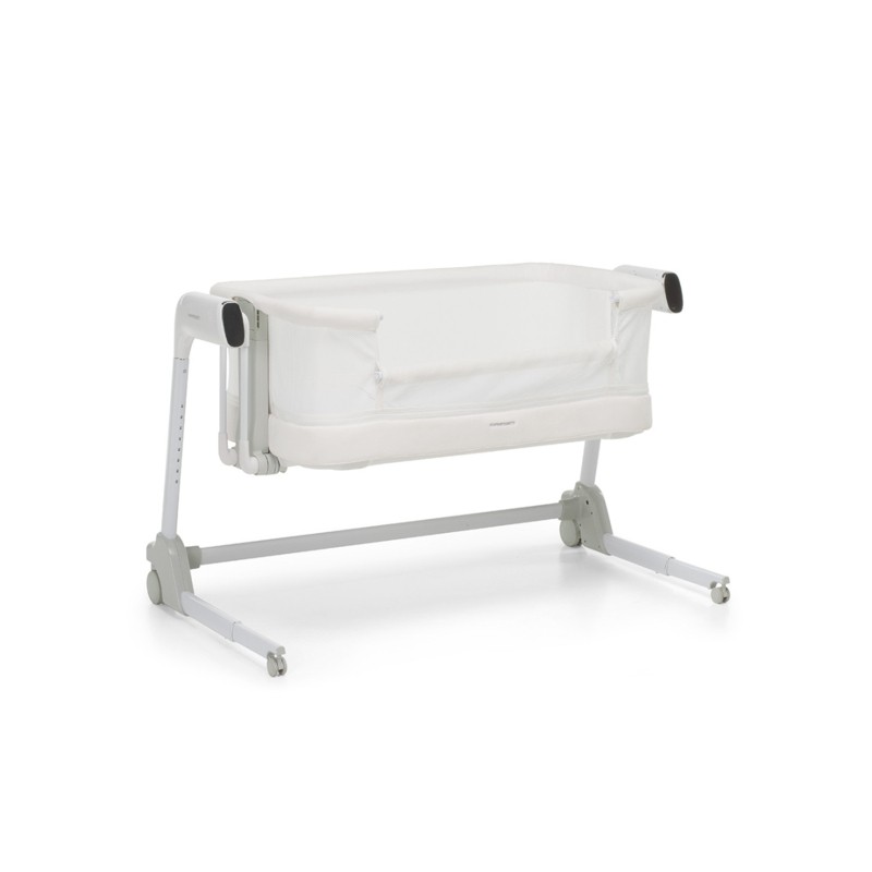La versione co sleeping con fianco apribile e utilizzabile dalla nascita fino a 9 kg di peso è regolabile in altezza in 8 posizioni con funzione anti reflusso Il dispositivo a dondolo con 5 velocità e scelta di 23 melodie musicali con display touch screen o telecomando in dotazione si attiva anche con il rilevamento pianto del bambino Ha tessuto a rete per garantire un ottimale areazione e dispositivo per il bloccaggio del movimento oscillatorio Ha doppia alimentazione a batteria o a corrente
