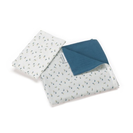 Il completo piumone double face per culla Evo di Foppapedretti Mammamia Collection è realizzato in mussola 100 cotone Oeko Tex ed è composto da fodera per piumino 100x100 cm e federa 35x25 cm