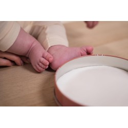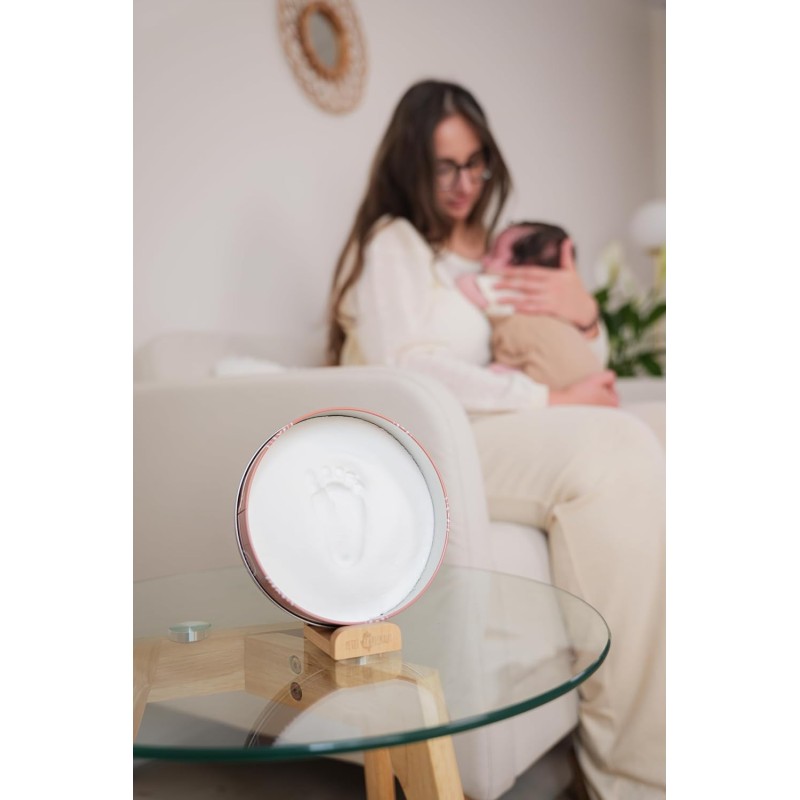 La scatola Baby include una scatola rotonda in metallo un pacchetto di argilla ipoallergenica un supporto un rullo di legno e istruzioni per creare facilmente la stampa