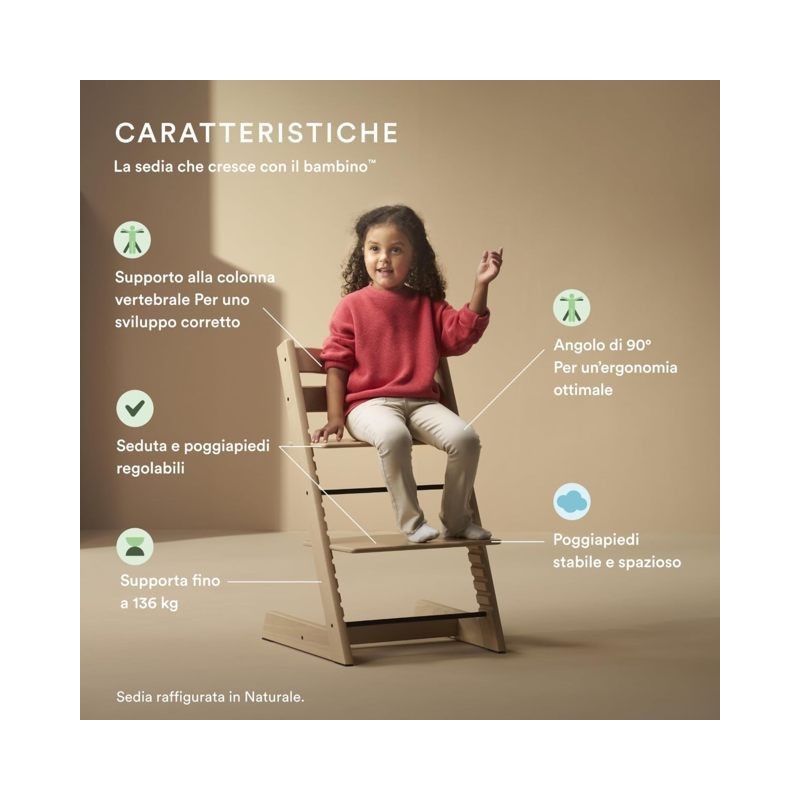 Attivante e regolabile Con un sedile e poggiapiedi regolabili Tripp Trapp consente la libertà di movimento Inoltre è disponibile in una vasta gamma di colori e due finiture in legno per dare un aspetto ideale a qualsiasi ambiente