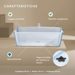LEGGERA E PORTATILE Il modello innovativo di Bath rende facile l uso a casa o in viaggio favorendo più tempo per il bagnetto In materiali di alta qualità durevoli Piega la vaschetta piatta e conservala per un facile utilizzo