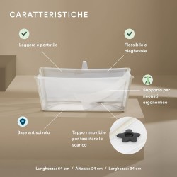 CARATTERISTICHE PRATICHE Con una base antiscivolo Flexi Bath è realizzata pensando alla sicurezza Inoltre il tappo di drenaggio termosensibile cambia colore dando ai genitori un indicazione visiva sulla temperature