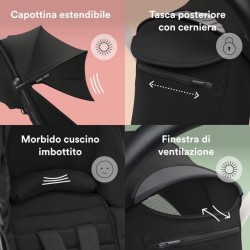 PROTEZIONE DA SOLE Mantieni il bambino fresco con la nostra capottina estendibile anti UV La finestra vedo non vedo offre ventilazione e visibilità Usa la tasca posteriore con cerniera per tenere gli oggetti essenziali a portata di mano