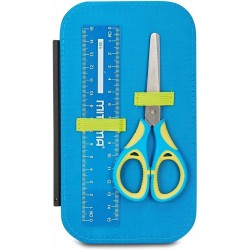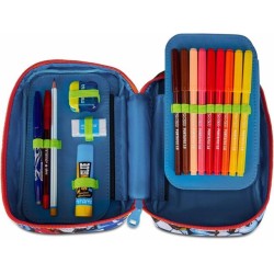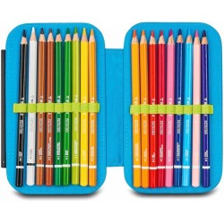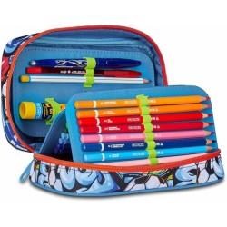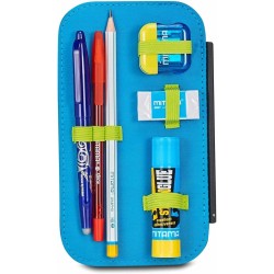 Altre caratteristiche Apertura singola tramite zip plance amovibili elastici interni per cancelleria CONTENUTO 44 PEZZI 1 penna cancellabile blu 1 penna sfera rossa 18 pastelli a colori 4 0 esagonali 18 pennarelli superlavabili punta 3 0 1 matita grafite esagonale HB 1 colla gialla azzurra 1 gomma bianca con cartoncino stampato 1 temperino barilotto 2 fori 1 righello trasparente azzurro 1 paio di forbici in metallo con maniglia in plastica