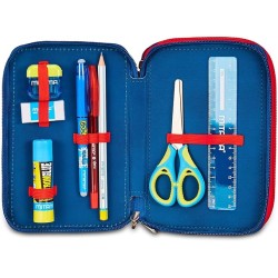 All interno troverai ben 44 pezzi di materiali scolastici tra cui 1 penna cancellabile blu 1 penna a sfera rossa 18 pastelli tondi 4 0 in cedro 18 pennarelli super lavabili 1 matita HB 1 colla 1 gomma 1 temperino 1 righello 1 forbice in metallo