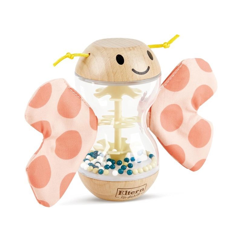 Rosalie the Papillon Sonchet Hape ha progettato un piccolo bastone da pioggia sotto forma di sonaglio in legno per bambini Le sue ali color corallo sono rimovibili grazie ai piccoli velcros La sua