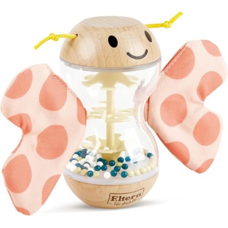 Rosalie the Papillon Sonchet Hape ha progettato un piccolo bastone da pioggia sotto forma di sonaglio in legno per bambini Le sue ali color corallo sono rimovibili grazie ai piccoli velcros La sua pancia è piena di piccole palline colorate che faranno rumore ogni volta che il bambino scuoterà il bastone da pioggia
