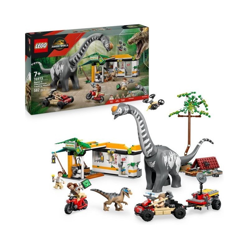 Dinosauri LEGO Jurassic World il set include un Titanosauro e un Velociraptor oltre a 3 minifigure dei personaggi di Zora Bennett di Martin Krebs e del Dr Henry Loomis con cui dare vita a tanti giochi creativi con dinosauri e a storie infinite