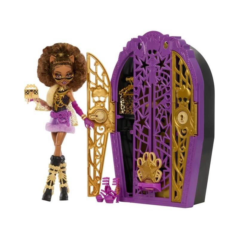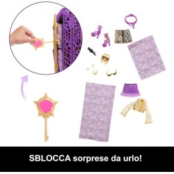 Inserisci il talismano alla base del guardaroba quindi aprilo come fosse una cerniera per rivelare la bambola Clawdeen Wolf in tutta la sua gloria graffiante Ripercorri le fasi quante volte vuoi per un divertimento senza fine