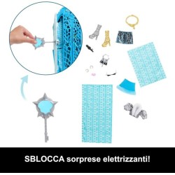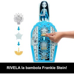 Inserisci il talismano alla base del guardaroba quindi aprilo come fosse una cerniera per rivelare la bambola Frankie Stein in tutta la sua elettrizzante gloria Ripercorri le fasi quante volte vuoi per un divertimento senza fine