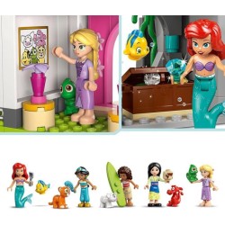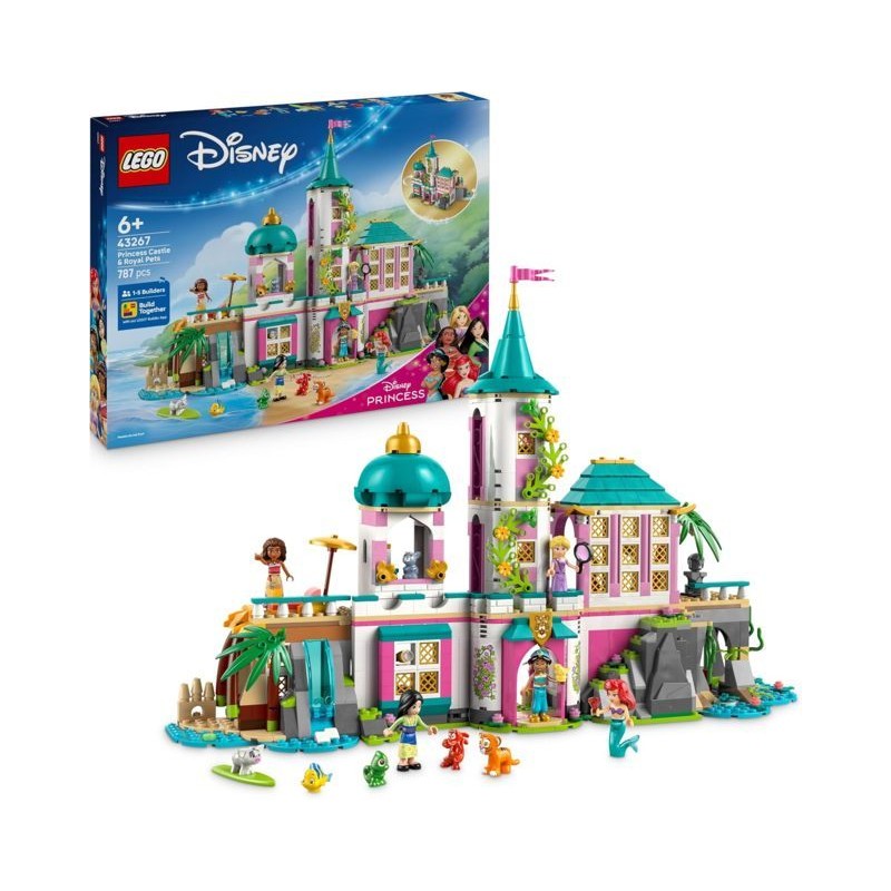 Cosa è compreso nel set Un castello LEGO costruibile a 3 livelli dotato di diverse stanze 5 mini bamboline dei personaggi LEGO Disney di Ariel Rapunzel Mulan Jasmine e Vaiana e i loro 5 animali domestici Flounder Pascal Rajah Pua e Mushu