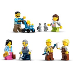 Cosa comprende la stazione LEGO City per tante ore di giochi di ruolo il set include una stazione a 3 livelli un automotrice per la manutenzione dotata di gru giocattolo a cestello 6 minifigure un bebè 2 piccioni e degli elementi binari LEGO