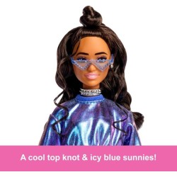 Questa bambola Barbie sfoggia un look estremamente metallico con un abito scintillante Il maglione corto blu ghiaccio si abbina perfettamente alla gonna a balze coordinata
