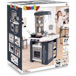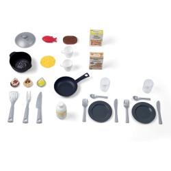 Sono inclusi 27 accessori 3 utensili da barbecue 6 posate 2 piatti 2 bicchieri 2 tazze 3 capsule di caffè 1 padella 1 soda 1 porzione di pasta 1 pentola con 1 coperchio 1 pesce magico e 1 bistecca e 2 scatole Per rendere ancora più realistico il gioco la cucina è dotati di effetti sonori che riproducono il suono della cottura cucina