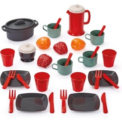 Contiene 34 accessori tra cui 4 piatti 4 set di posate 4 bicchieri 4 tazze 1 caffettiera 1 zuccheriera 1 casseruola e frutta Adatto a partire dai 18 mesi