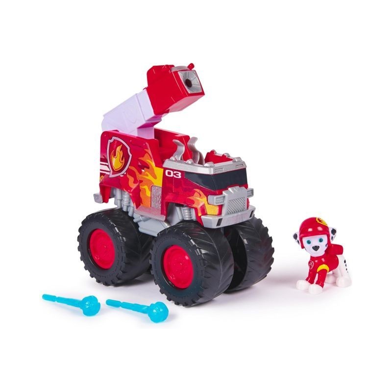 LANCIAMISSILI il camion dei pompieri di Marshall in stile Monster Truck è dotato di 2 proiettili con speciali vani stiva Carica il proiettile nel lanciamissili e poi premi il pulsante per sparare e risolvere la situazione