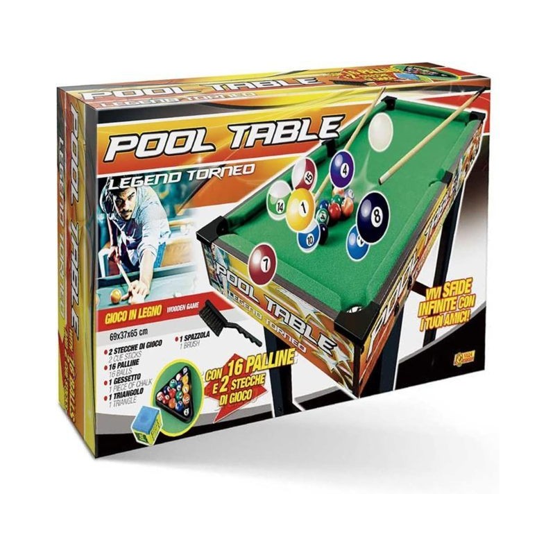 Il Biliardo Legend Torneo è un tavolo da biliardo completo realizzato in legno di alta qualità Questo set include tutto il necessario per giocare a biliardo come stecche palline triangolo gessetti e una scatola litografata per conservare gli accessori Con dimensioni di 69 x 37 x 65 cm questo biliardo è perfetto per i piccoli giocatori o per spazi più ridotti Potrai posizionarlo comodamente in casa tua o in qualsiasi altra stanza dedicata al gioco Il design elegante e resistente del Biliardo Legend Torneo ti garantirà ore di divertimento Potrai organizzare sfide con amici e familiari migliorando le tue abilità nel gioco del biliardo La superficie di gioco liscia e uniforme ti permetterà di effettuare colpi precisi e di ottenere risultati soddisfacenti La presenza di stecche di qualità palline perfettamente bilanciate e un triangolo ben progettato ti offriranno un esperienza di gioco autentica Potrai affinare la tua tecnica e goderti le sfide competitive che solo il biliardo può offrire