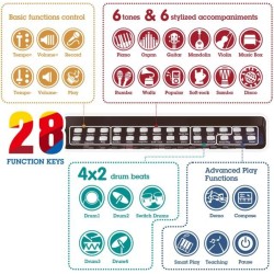 SEI STRUMENTI IN UNO oltre a essere esteticamente bello il pianoforte elettrico propone il suono di diversi strumenti 6 semplici melodie da suonare e 8 ritmi di batteria La tastiera elettrica può riprodurre il suono di pianoforte organo chitarra mandolino violino o carillon