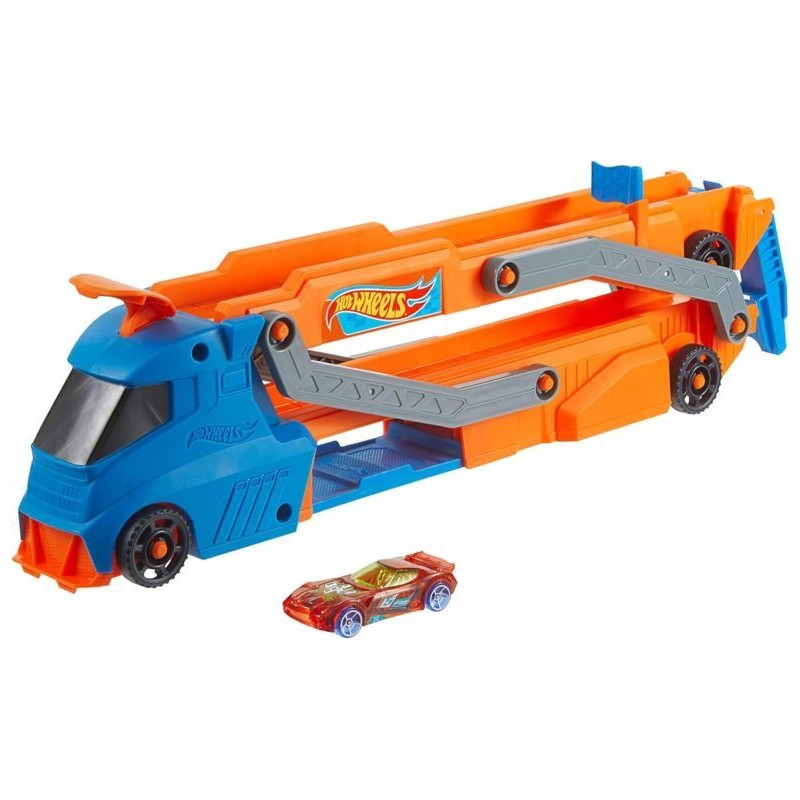 Carica le tue auto Hot Wheels preferite e guida attraverso Hot Wheels City con questo trasportatore con Pista Super Velocità